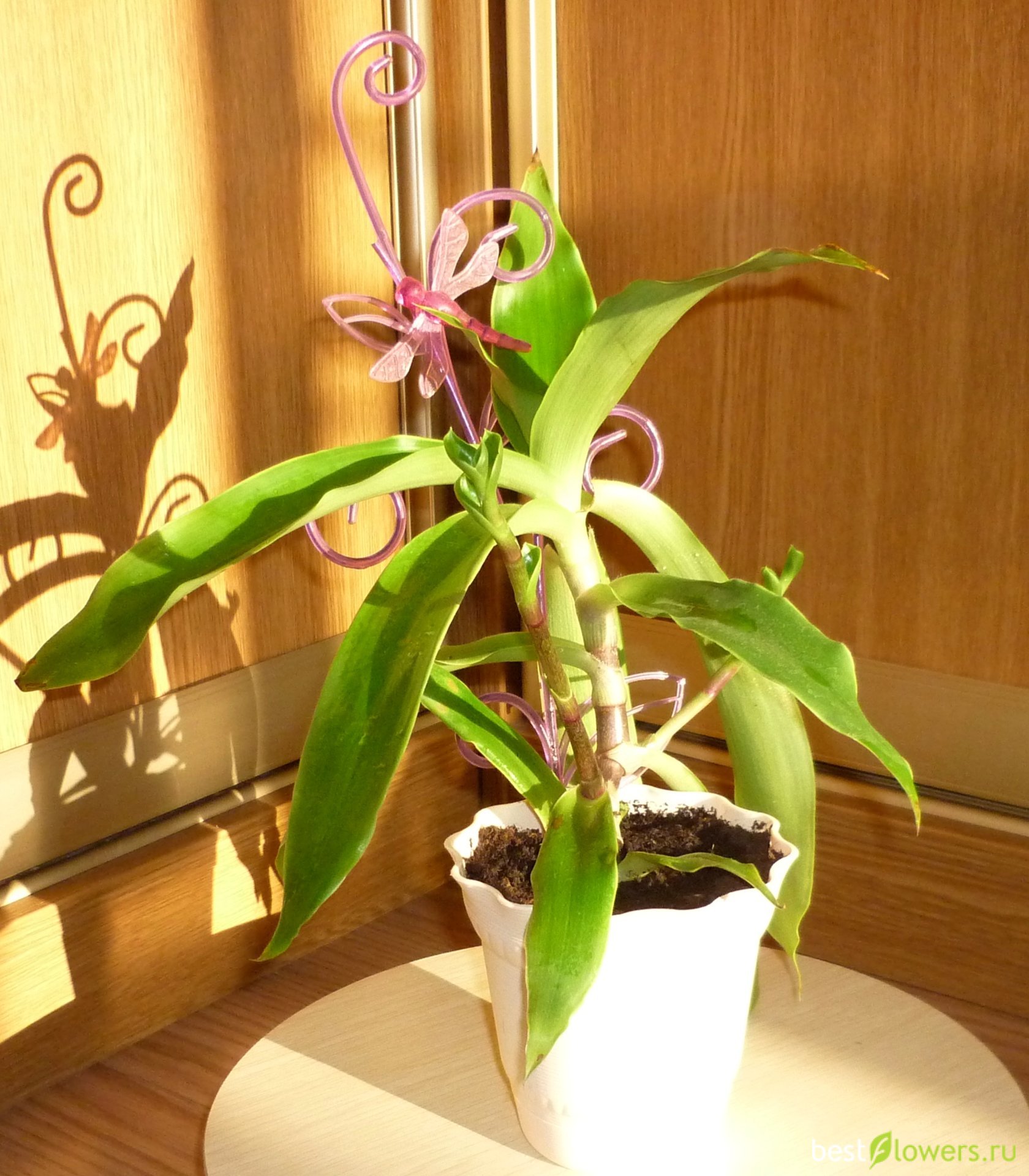 Можно отделить от бокового горизонтального побега розетку листьев с небольшим отрезком стебля и высадить ее в сосуд с водой. Недели за две у розетки разовьется мощная корневая система, и ее можно будет высадить в горшок с влажным грунтом.