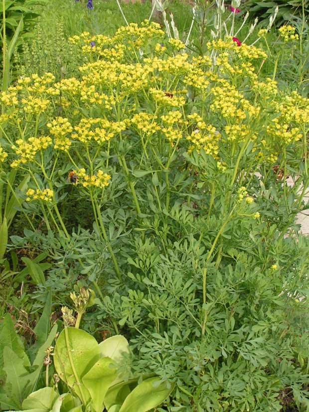 Но это еще не все достоинства руты. Ко всем своим полезным качествам она еще и декоративна и вполне может служить украшением сада. Это невысокое (до 60 см) вечнозеленое многолетнее полукустарниковое растение цветет с конца июня и до начала осени, цветки у него мелкие, желтые, собраны в соцветия.Наиболее красивы ее рассеченные ажурные сизо-зеленые листья. В Европе выведены сорта руты с пестрыми и голубоватыми листьями, правда, у нас пока семена этих сортов в продаже не встречались. Впрочем, и обычную руту можно с успехом применять в миксбордерах и невысоких бордюрах — ее легко стричь и формировать.