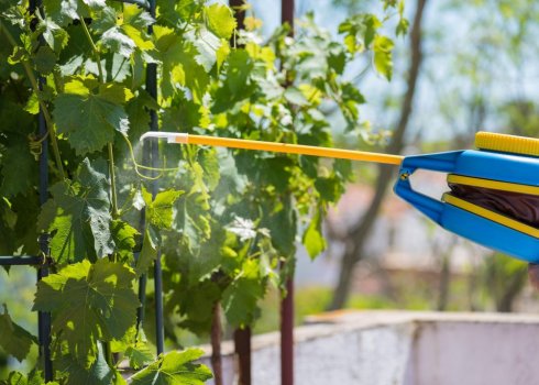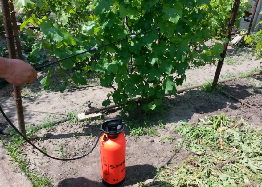 Опрыскивание кустов производится сверху вниз с обильным поливом всех поверхностей лозы, шпалеры и почвы вокруг растения. Химикат токсичен, поэтому понадобится защитная одежда, перчатки и очки.