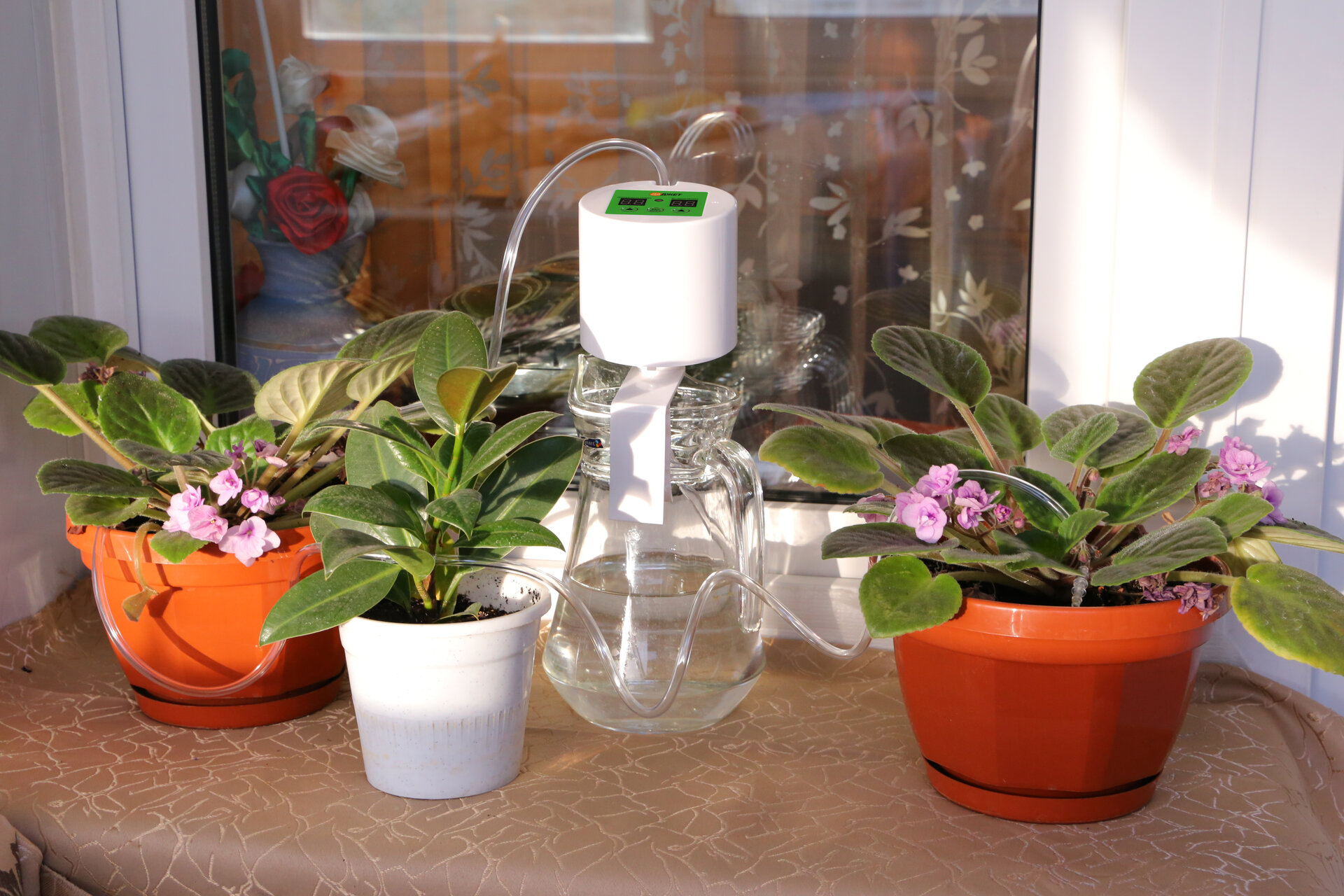 Такая система автоматически поливает цветы через определенные промежутки времени. Ее лучше купить заранее, чтобы проверить эффективность работы установки. Во-первых, сохраняется риск получить некачественный продукт. Во-вторых, необходимо настроить полив с учетом требований комнатных питомцев.