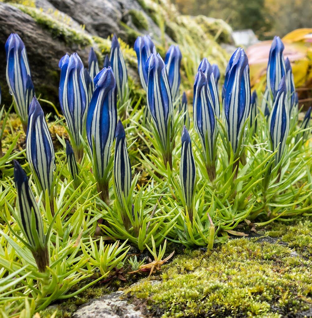 Китайская гентиана – это высокогорный цветок, произрастающий на высоте 5000 м. Стелющийся полукустарник высотой около 15 см и шириной 0, 3 м. Соцветия удлиненные, воронковидные, размером 30-50 мм, покрыты продольными светлыми полосами. Цветение длительное – с конца весны до начала осени. Известные гибриды: Литл Пинки, Блю Стар.