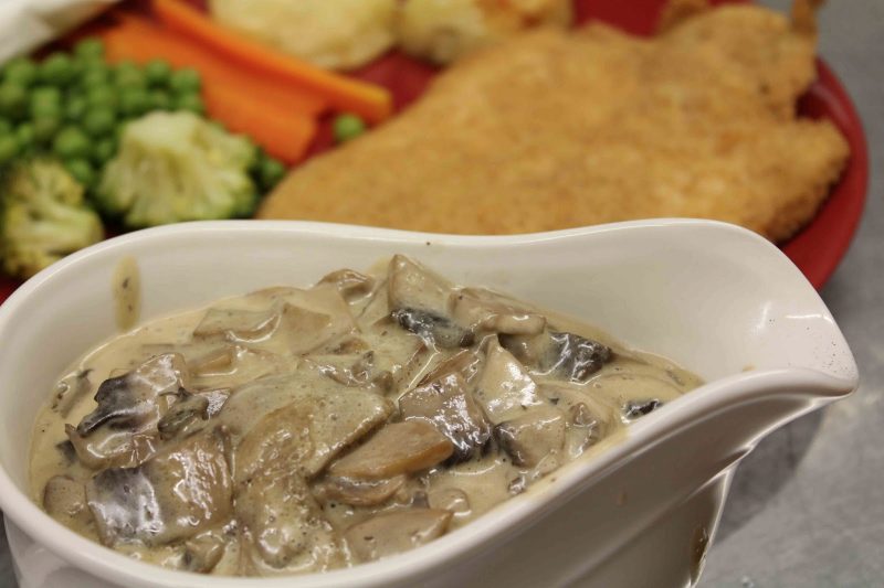 Соус получается густой, с кислинкой сметаны и с лёгкой ноткой мускатного ореха (главное — не переборщить с ним) и очень насыщен вкусом шампиньонов.