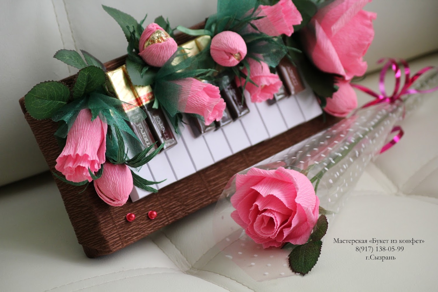 новогодний букет из батончиков своими руками по мастер-классу, композиции с тюльпанами и другие, оформление коробки конфет на День учителя