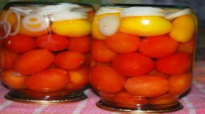 Вместе с луком консервируют сорта помидоров, обладающие плотной мякотью и толстой шкуркой, которая не потрескается при соприкосновении с горячей маринадной заливкой.