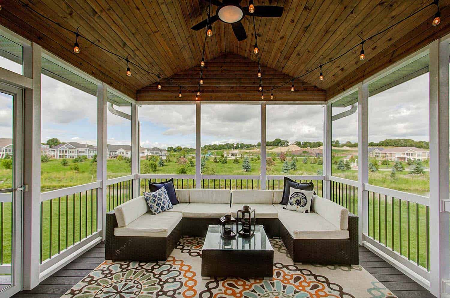 Интерьер такой закрытой площадки можно оформить как обычную гостиную: здесь уместны мягкие диваны, столы и даже кухонный гарнитур. Главное — никакая погода не помешает прекрасному отдыху!