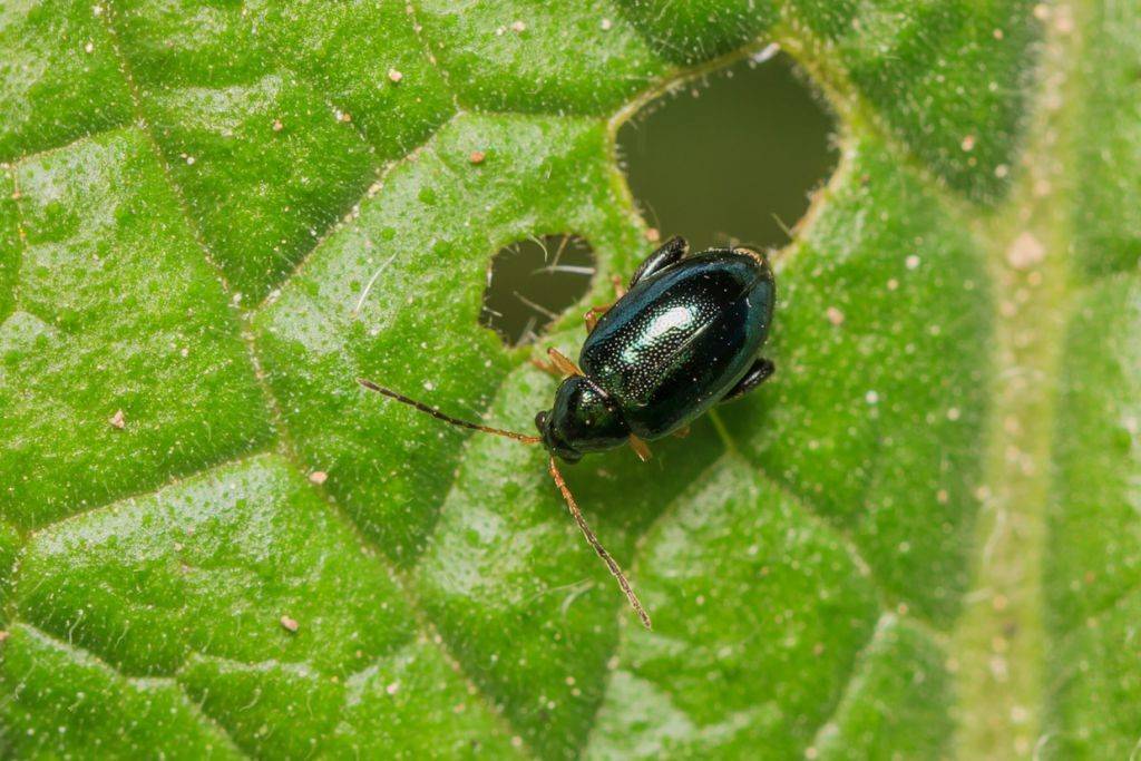 Блошки обосновываются на растениях и в листьях выедают небольшие сквозные отверстия.