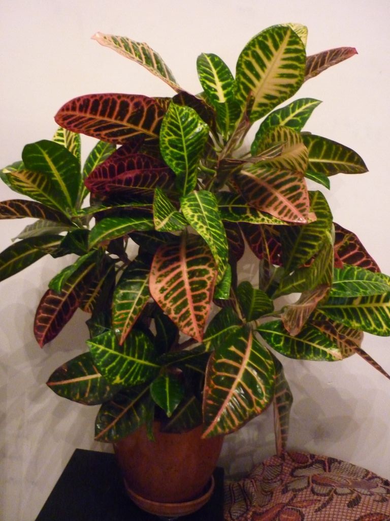 C. variegatum var. pictum : Большие ярко окрашенные листья оранжевого, красного, бронзового, зеленого, пурпурного и желтого цветов; вырастает от 3 до 6 футов как комнатное растение