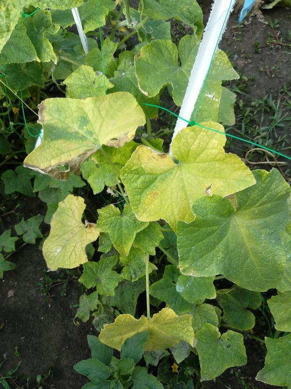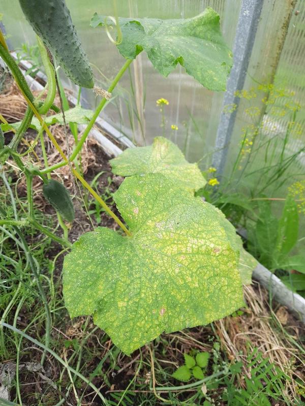 Это может быть так же в начале развития огуречной плети или, наоборот, под конец сбора урожая. А так же, при очень большом количестве плодов. Это значит, что листья «обеднели», отдали все ценное, что было заложено в них.