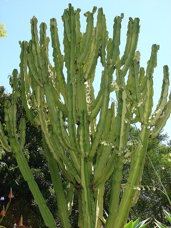 | Трехгранный | Многолетник. В домашней обстановке при правильном уходе вырастает до 3 м. Широкий мясистый треугольный ствол покрывают колючки. Концы стеблей усыпаны ярко-зелеными листочками. Со временем они опадают. Цветет редко. Размножается самосевом. |