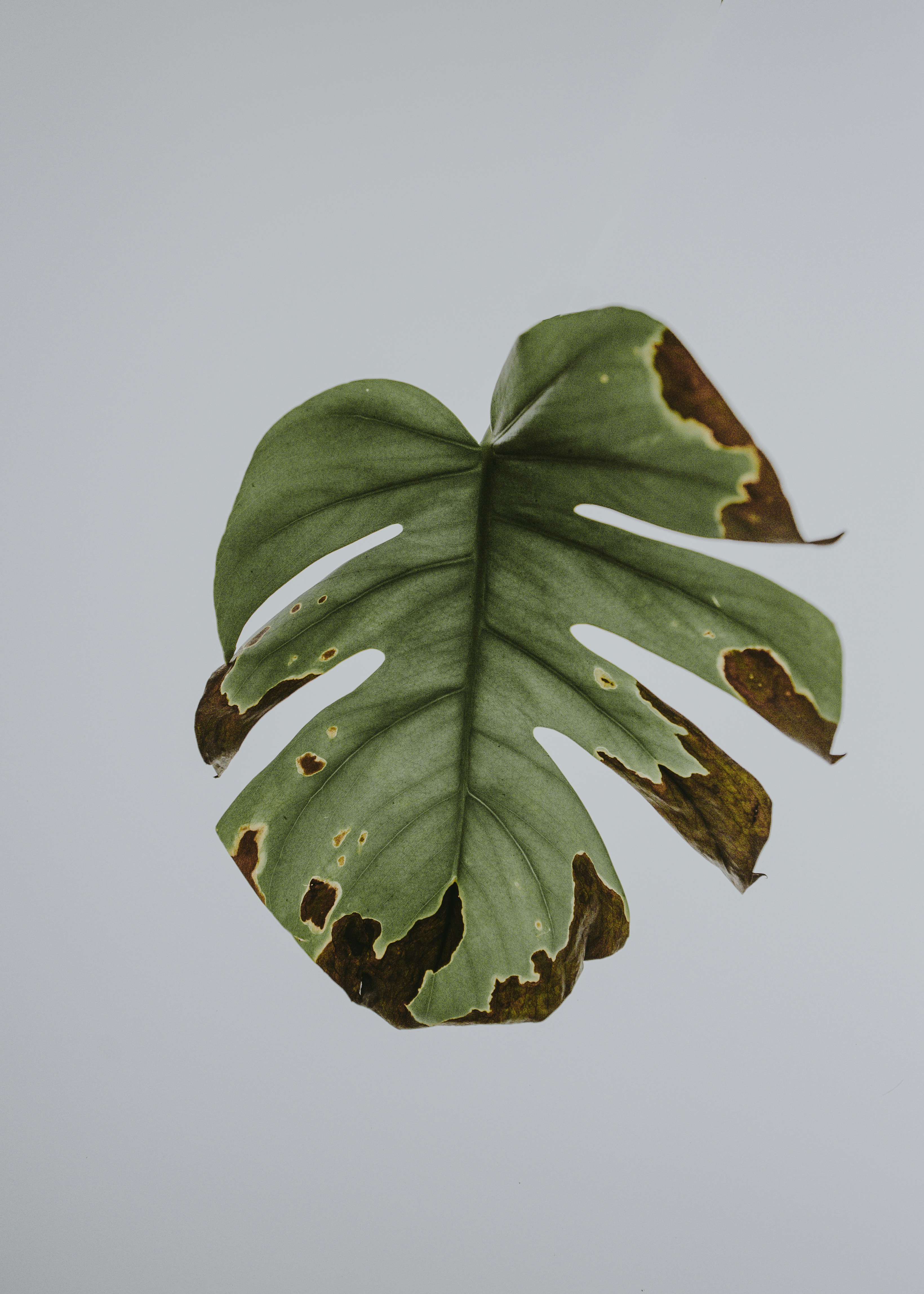 Коричневые пятна на листьях монстеры могут быть последствиями ожогов. В этом случае повреждённые листья необходимо удалить, а для лианы подобрать более затенённое место, отодвинуть от окна или зашторить.