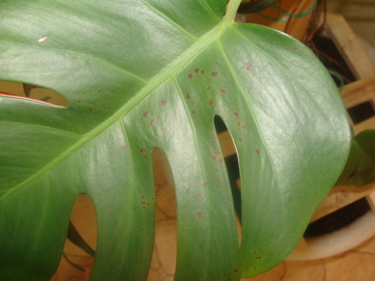 Темные пятна на листьях монстеры свидетельствуют о сухости воздуха. Болезнь: мало влаги. Данное растение необходимо регулярно опрыскивать или обтирать листья мягкой водой. Летом это делают 2-3 раза в день, зимой — в зависимости от температуры содержания, но минимум 1 раз в день.