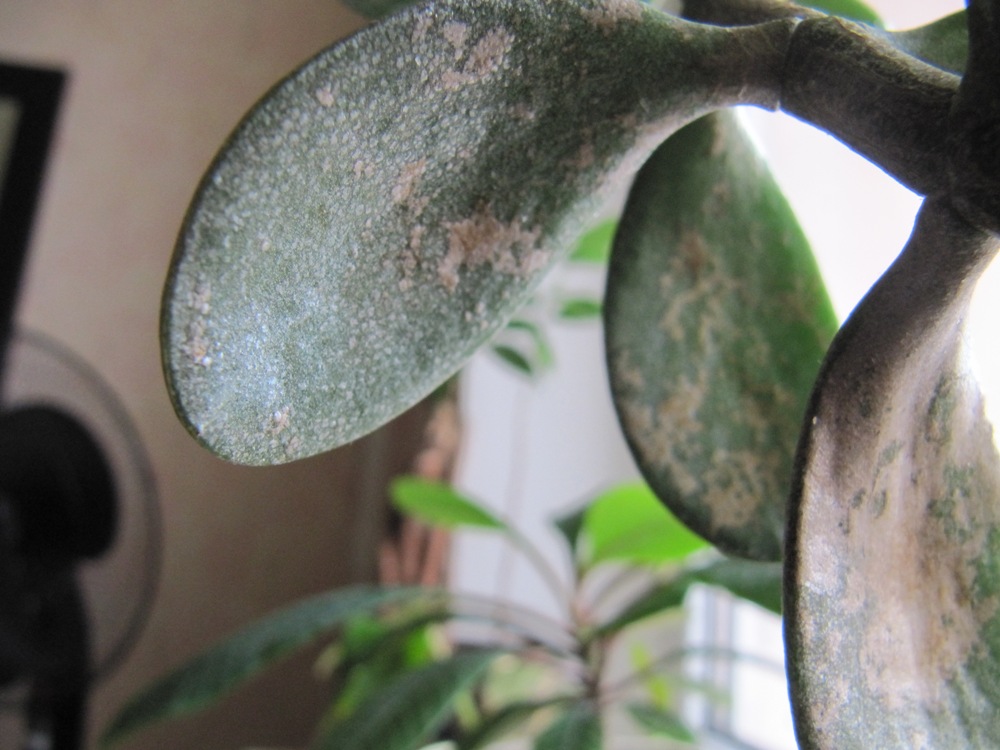 Иногда на листьях денежного дерева можно видеть серебристый налет. Это начало возникновения грибкового заболевания «мучнистая роса». Болезнь хорошо развивается при обилии влаги в грунте и воздухе.