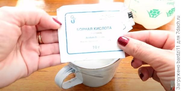 Для полива борную кислоту разводят в пропорции 1–2 грамма на 10 л воды.