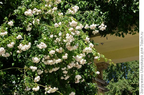 Роза самостоятельно поднимается по опоре, заплетает шпалеры, заборы, решетки