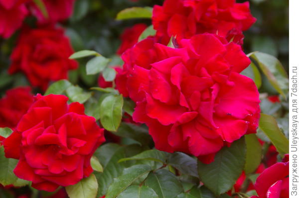 Бутоны крупных размеров окрашены в броский пурпурный или малиновый цвет. Форма роз классическая, шаровидная в полном раскрытии.