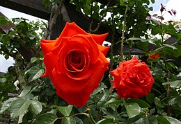 Новое явление среди плетистых роз! Крупные, красивой формы ярко-оранжевые цветки на вертикально растущем кусте. Появляются по одному или в аккуратных кистях до 5 шт, на длинных сильных побегах. Листва крупная, блестящая, устойчивая к болезням, с малиновым молодым приростом. Нарастает в высоту не очень быстро и иногда используется как шраб, но в жарком климате это сильнорослая роза. Особенно хороша на столбе, так как цветки появляются на разных уровнях куста, а не только на вершине.