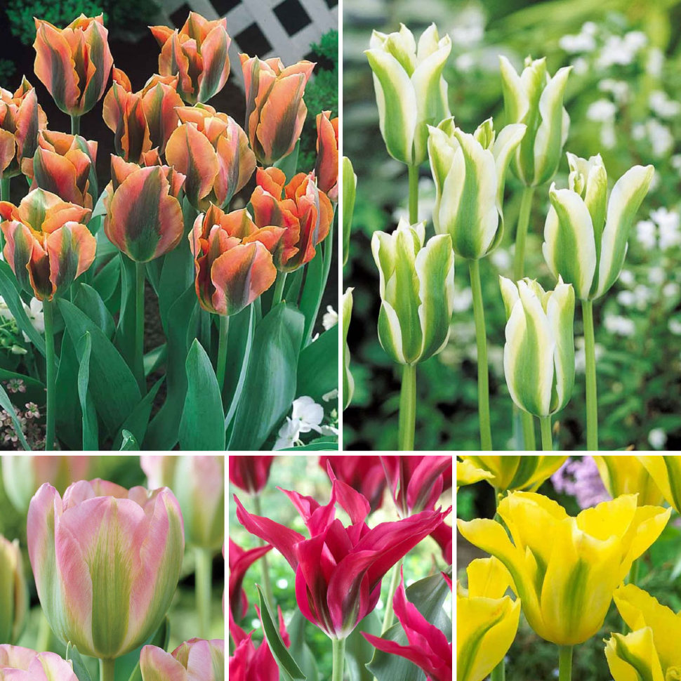Тюльпаны Viridiflora — одни из самых долгоцветущих сортов. Их наиболее яркая особенность, также известная как зеленый тюльпан, — это зеленая полоса на лепестках, которая контрастирует с основным цветом. Большинство тюльпанов виридифлоры цветут поздней весной и имеют высоту стебля от 16 до 24 дюймов.