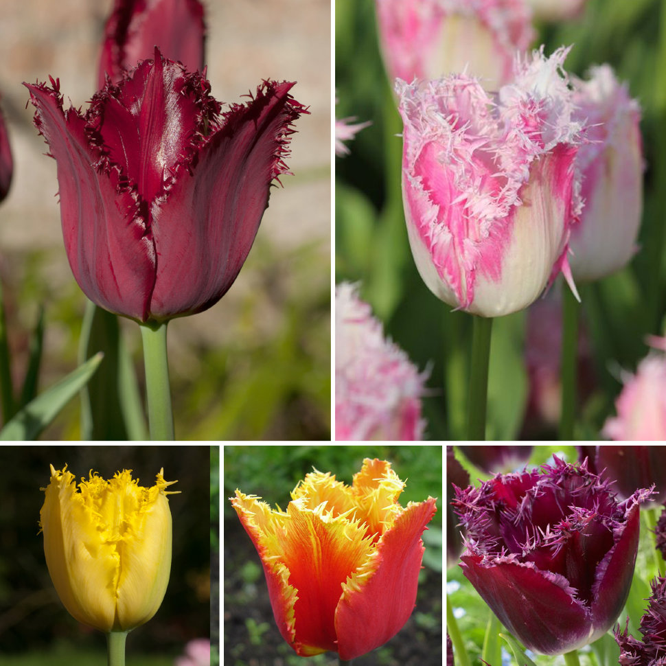 Тюльпаны с бахромой известны своим мягким и вычурным видом. Также известные как тюльпаны Crispa, популярные цвета включают розовый, красный, белый и желтый.