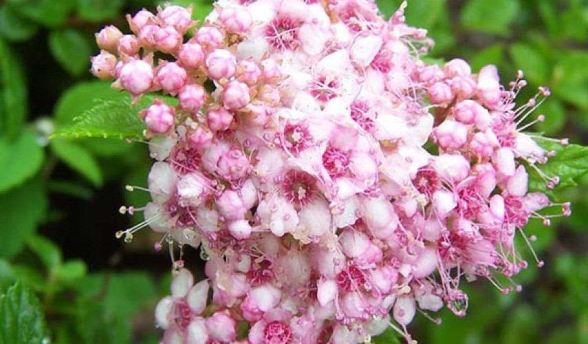 - Если хотите использовать розовые цветы спиреи как акцент, нужно посадить её рядом с кустарниками, которые цветут менее выразительно, главное, чтобы период цветения у них совпадал.