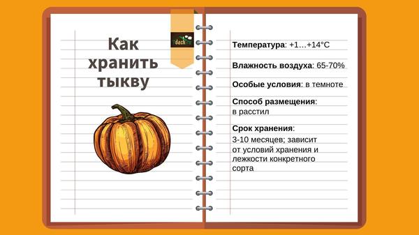 Для хранения этого овоща подходят темные помещения, в которых температура должна составлять от +3 до 10 градусов. Тыква может храниться достаточно долго. Если влажность будет повышенная, то срок годности тыквы уменьшится месяца на 2 или 3. Помещение должно проветриваться.