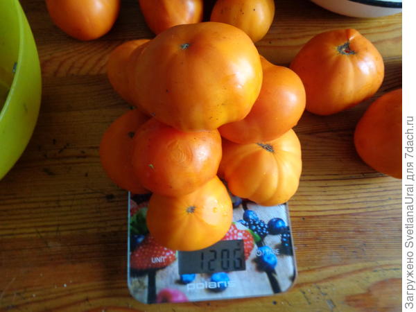 Выращивание Медового гиганта пришлось на лето не самое благоприятное для томатов: холодно, дожди, отсутствие солнца. Вкус плодов до оценки отлично не дотянул, но урожайность и размеры томатов не подкачали.