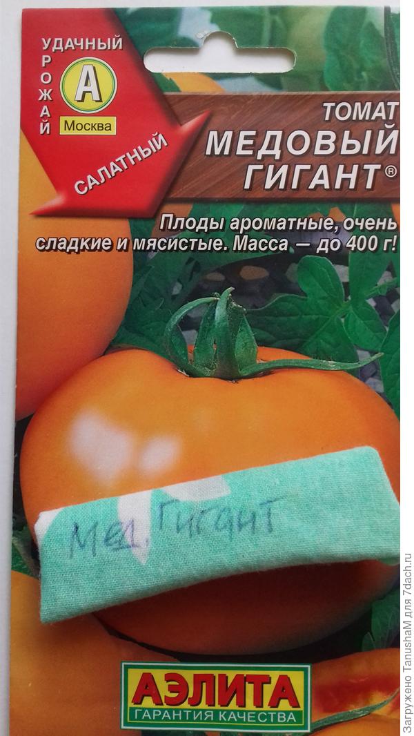 Помидоры сорта Медовый гигант названы так не случайно, название напрямую отражает физические параметры растения. Сорт является разработкой отечественных селекционеров. Массово распространяется с 2001 года, садоводы часто называют его Великаном.