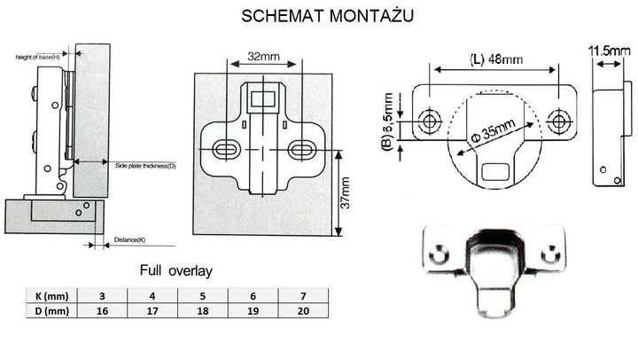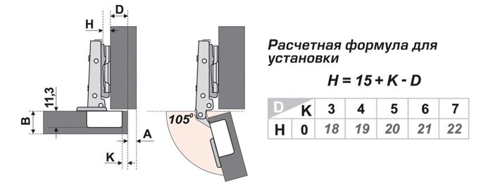 Схема установки ответной планки и петли с чашей будет немного отличаться для накладной, угловой и внутренней петли. Также разный диаметр врезки требуется для петель с чашами диаметра 35мм и 26мм.
