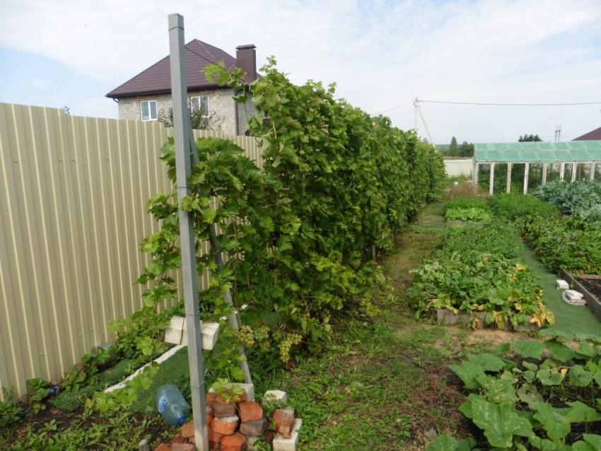 Виноградные побеги с каждым месяцем прибавляют в длине несколько сантиметров или метров. Чтобы виноградник красиво вился вверх, для него устанавливают металлические или деревянные шпалеры, которые можно приобрести в любом специализированном магазине или сделать самостоятельно. Столбцы опоры закапывают в грунт на глубину не менее полуметра и уплотняют землю вокруг них.